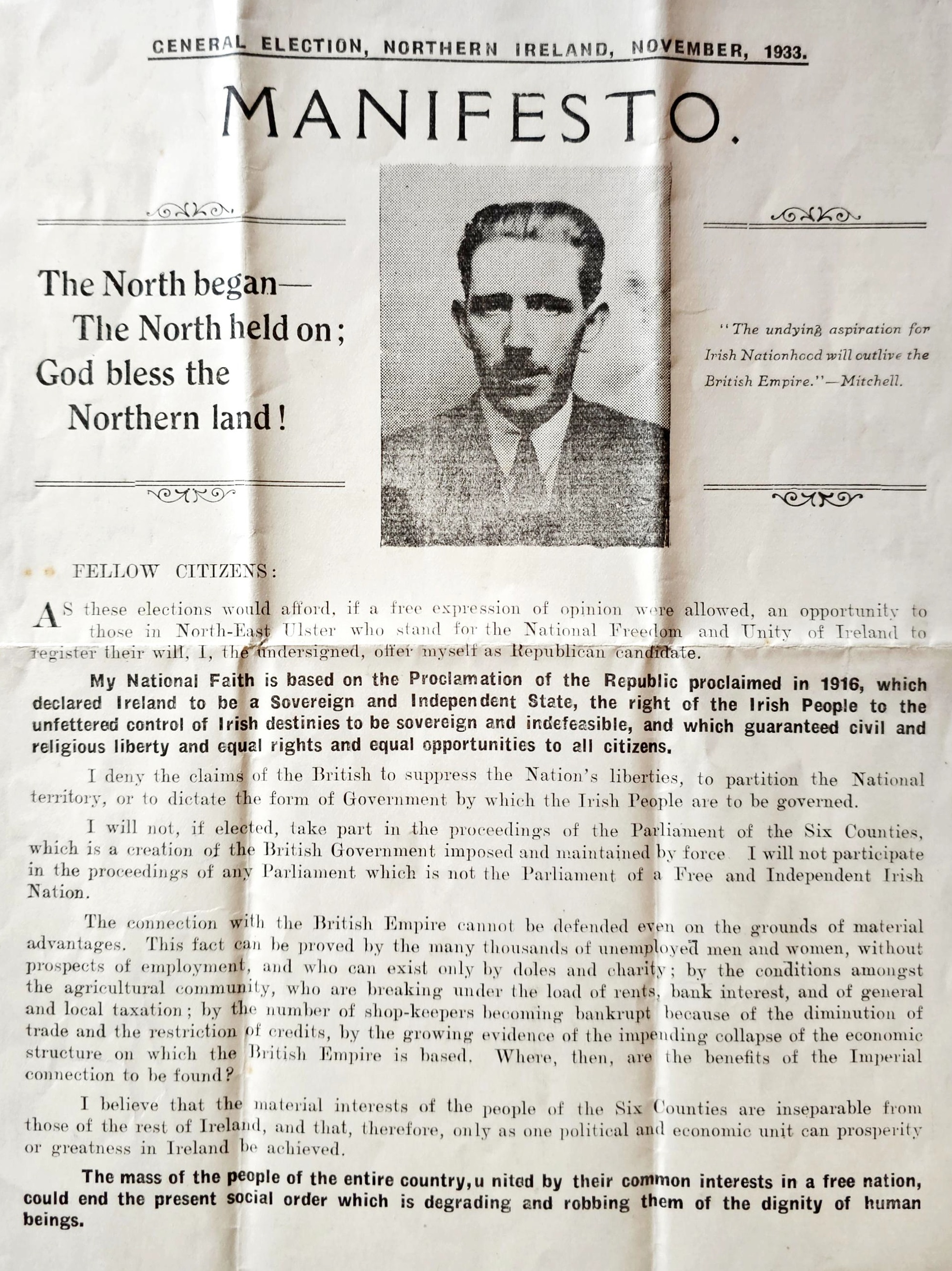 From the 1933 Northern Ireland Election a leaflet from Seán McCool running as a Republican un Derry City-Foyle. He polled 3,031 votes whilst his opponent James McCarroll (Nationalist) polled 6,557 votes. McCool was a prominent Republican and former Chief of staff of the IRA.