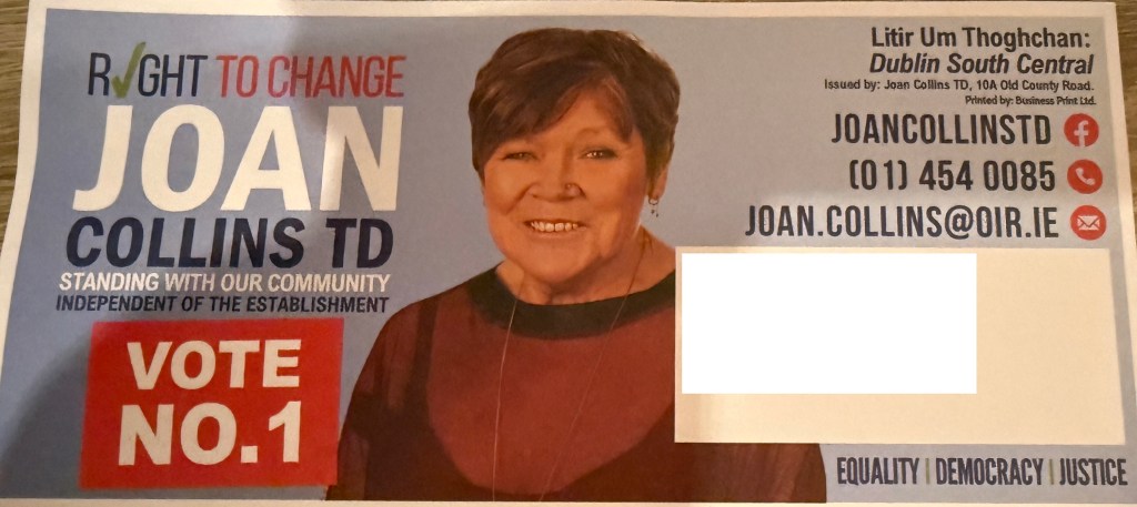 Leaflet from Joan Collins – Right To Change – Dublin South Central – 2024 General Election November 14, 2024
