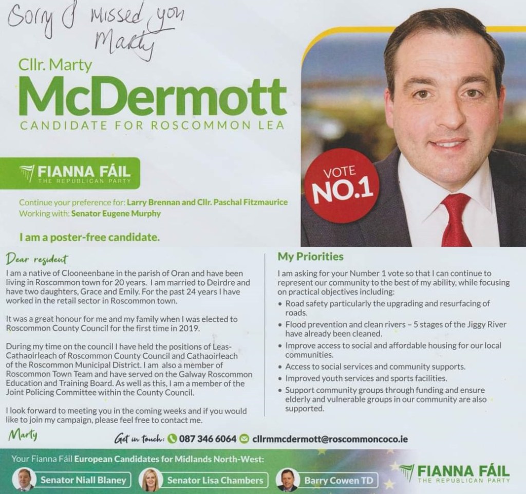 A leaflet from Marty McDermott who is running for Fianna Fáil in the Roscommon LEA in the 2024 Local Elections