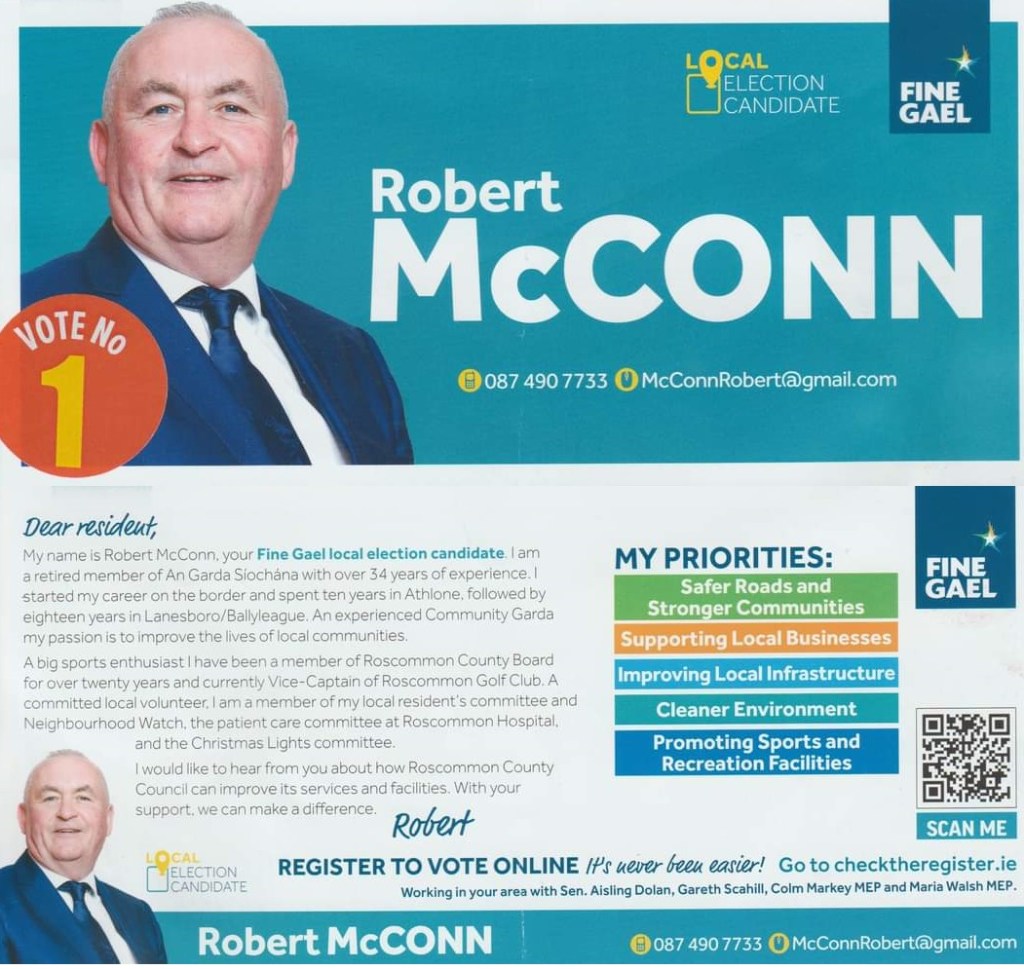 A leaflet from Robert McConn who is running for Fine Gael in the Roscommon LEA in the 2024 Local Elections.