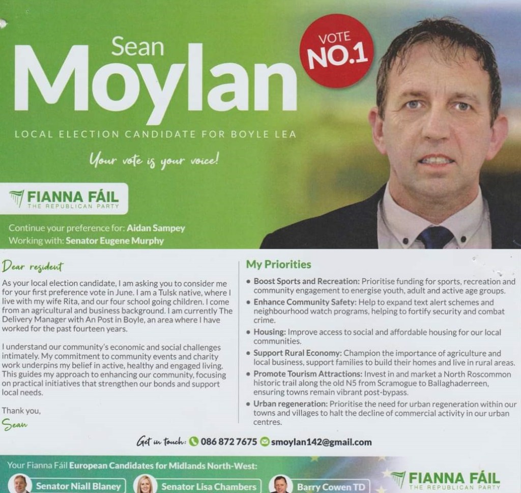 A leaflet from Sean Moylan who is running for Fianna Fáil in Boyle in the 2024 Local Elections