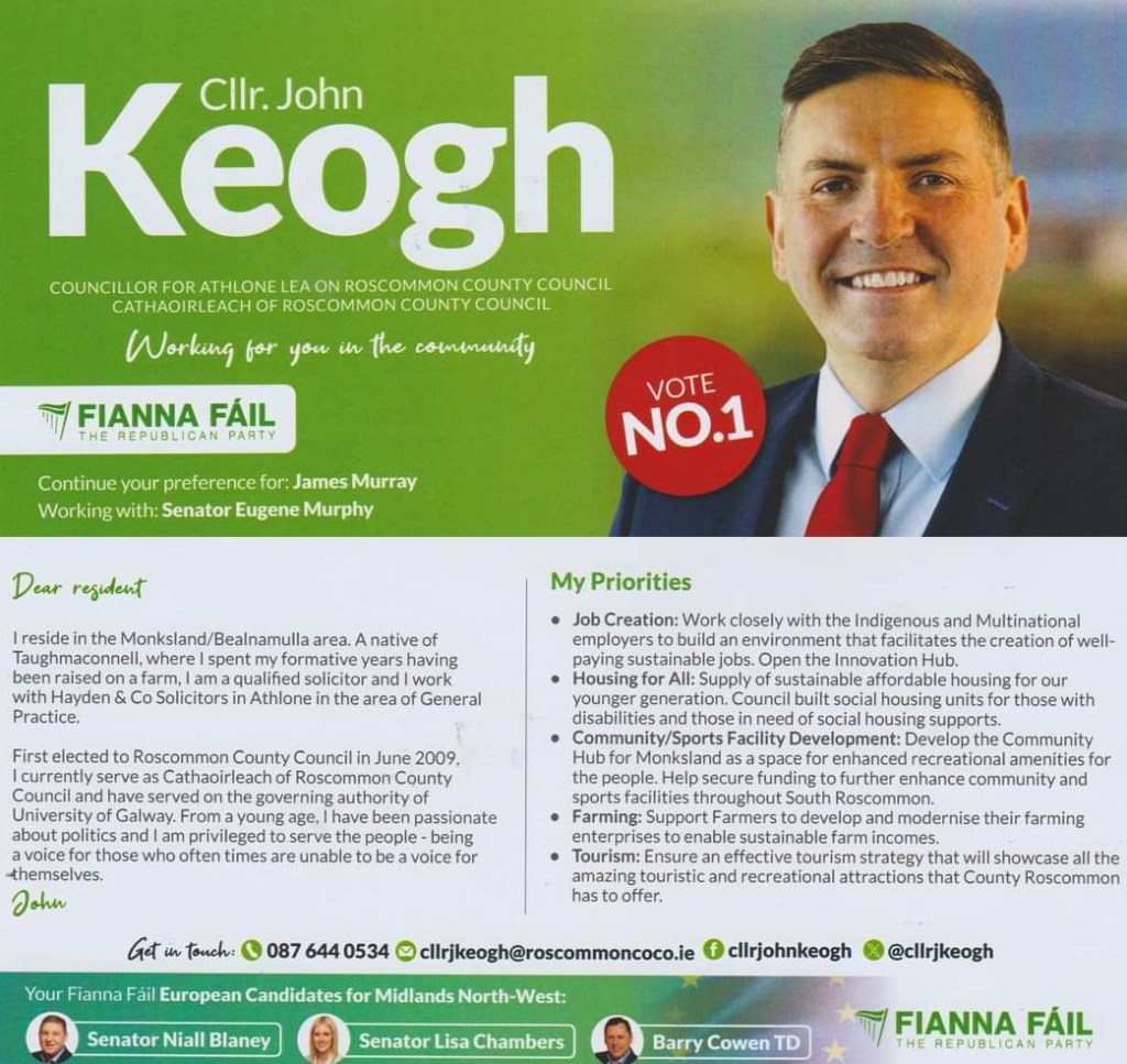 A leaflet form John Keogh who is running for Fianna Fáil in Athlone (Roscommon) in the 2024 Local Elections