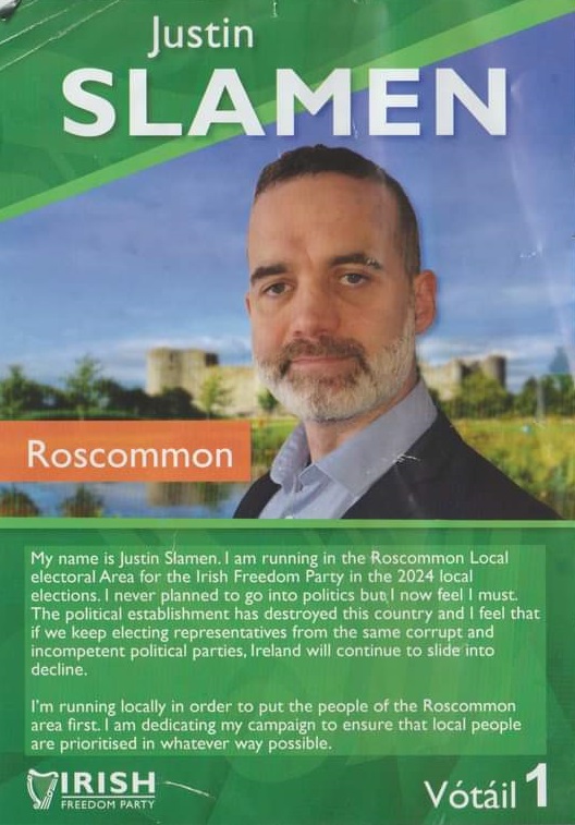 A leaflet from Justin Slamen who is running for The Irish Freedom Party in the Roscommon LEA in the 2024 Local Elections