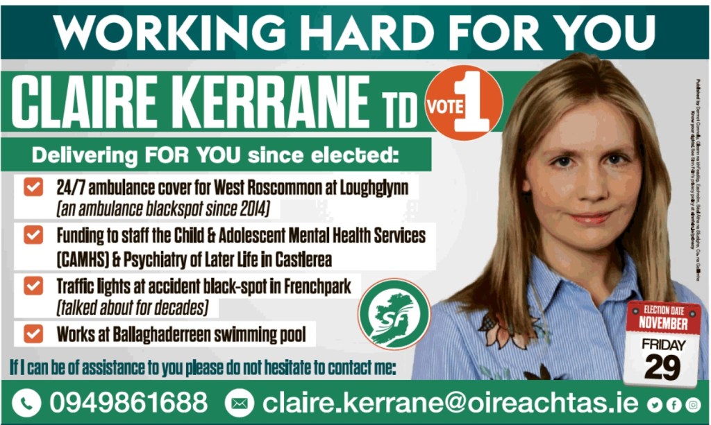 An ad for Claire Kerrane who is running for Sinn Féin in Roscommon Galway in the 2024 General Election
