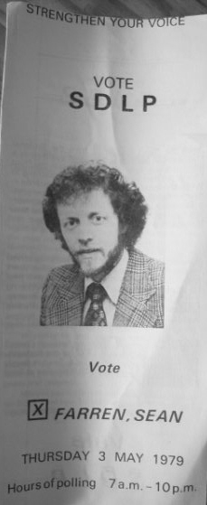 From the 1979 Westminster Elections a leaflet for Sean Farren of the SDLP running in North Antrim. Powersharing is amongst the items covered.