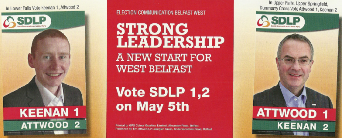 From the 2011 Assembly Elections a flyer for SDLP candidates Alex Attwood and Colin Keenan who were running in West Belfast. Attwood polled 3,765 votes and won a seat. Keenan polled 802 votes and missed out.