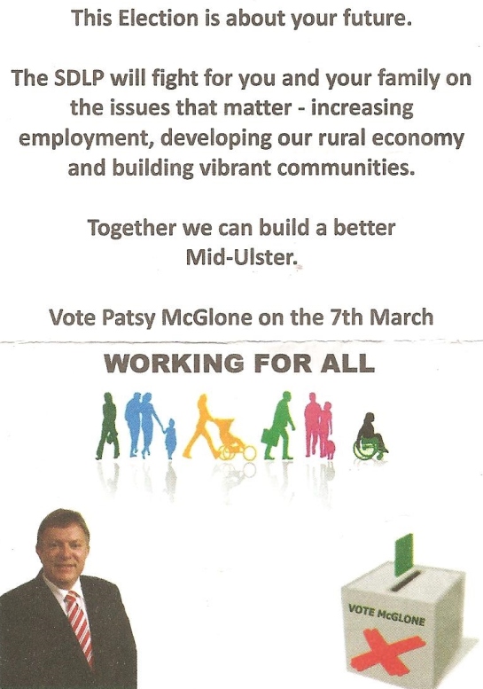 From the 2011 Assembly Elections a leaflet for SDLP candidates in Mid Ulster Patsy McGlone and Austin Kelly. Patsy McGlone is the Deputy leader of the SDLP.