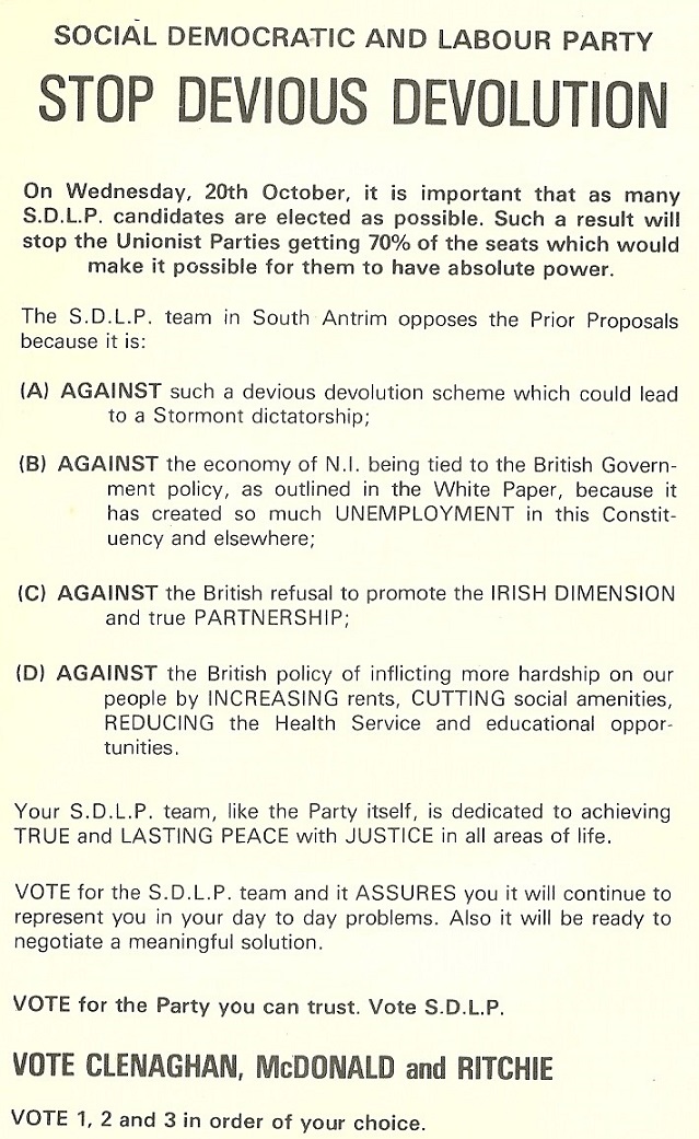 From the 1982 Assembly Elections, a leaflet from John Clenaghan, Patrick Ritchie and James McDonald who were running for The SDLP in South Antrim. James McDonald was elected. The Result is available here