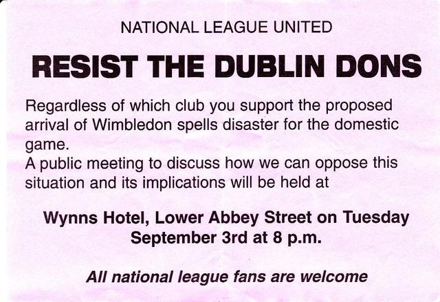 “Resist The Dublin Dons”- Flyer for National League United meeting against move of Wimbledon to Dublin. April 26, 2012