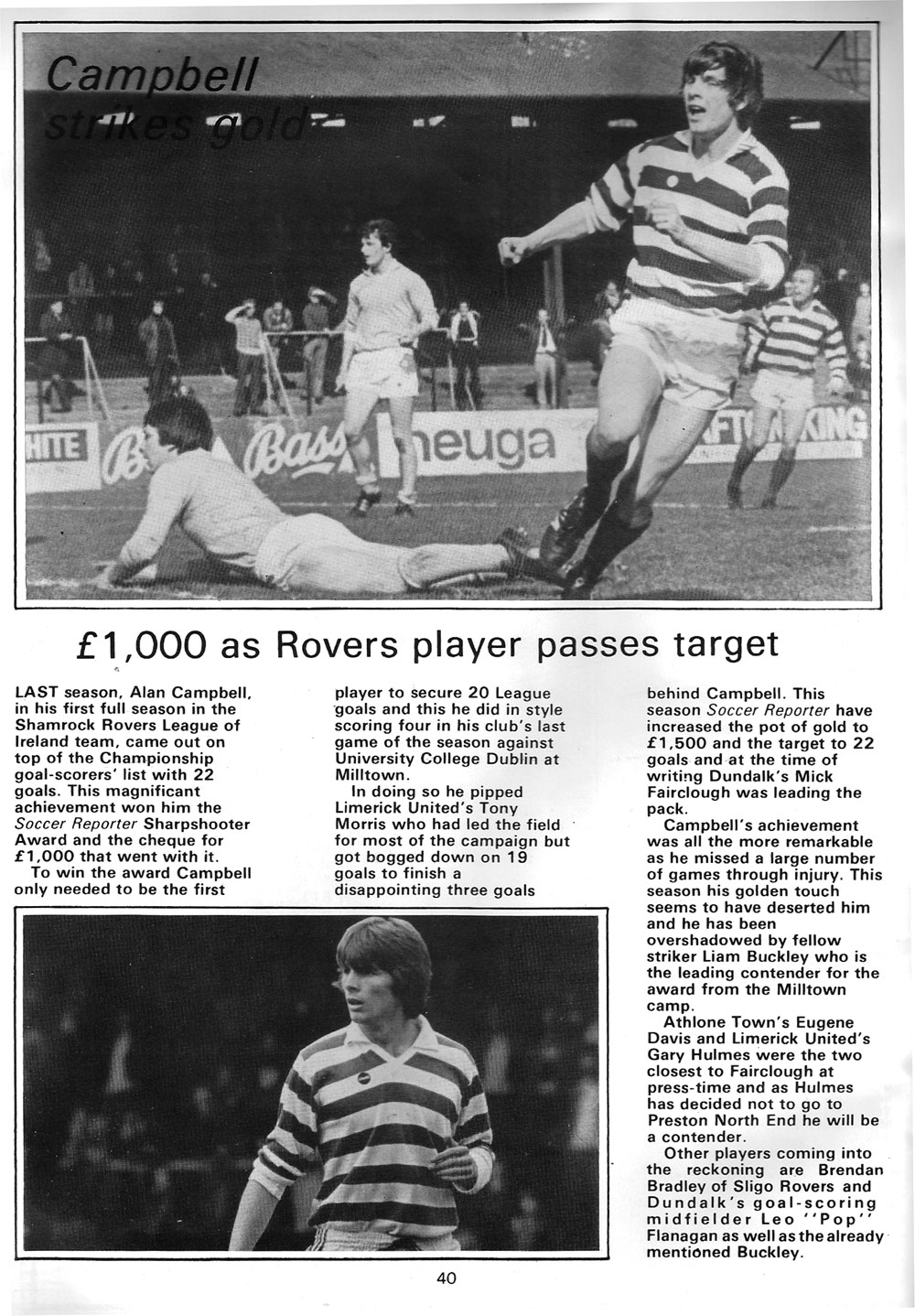 An article about Shamrock Rovers and the Leagues top scorer Alan Campbell from the Irish Soccer Reporter Annual 1981. With 22 goals in the 1979-80 season, He won The ‘Soccer Reporter Sharpshooter award’ of a then fairly hefty £1,000.
