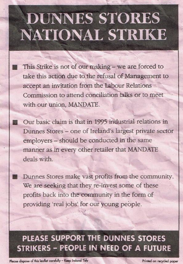 From 1995 a “Dunnes Stores National Strike” leaflet produced by the Trade Union Mandate. Interesting to see ‘Zero Hour Contracts” being an issue back then.