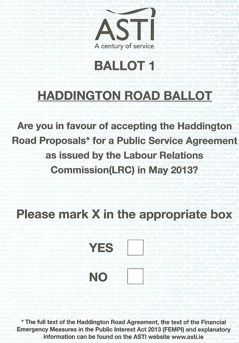 Ballot Papers on the Haddington Road Agreement from the ASTI as well as a letter describing the procedures and so on about the vote. One Ballot is on Industrial Action and the other on the Haddington Road agreement itself.