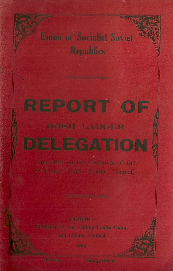 In 1929 a delegation from the Dublin Trades Union and Labour Council made the journey to Moscow to coincide with the twelfth anniversary celebrations of The October Revolution. The delegation included Miss K. N. Price, W McMullen, T Geehan, H.S. Ward, T Waldron, H J Tucker, Helena Molony, P Holohan, P.T. Daly and Robert Tynan. On Returning from their mission they issued this report. It is 56 pages , contains photographs, a description of their Journey, conditions of Workers Rights and details of the places visited during the visit.