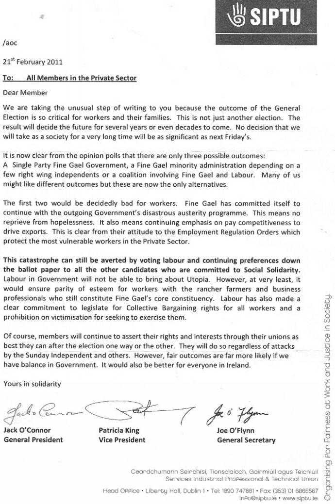 Pre Election letter from Jack O’Connor asking SIPTU Members in the Private Sector to vote Labour March 3, 2011