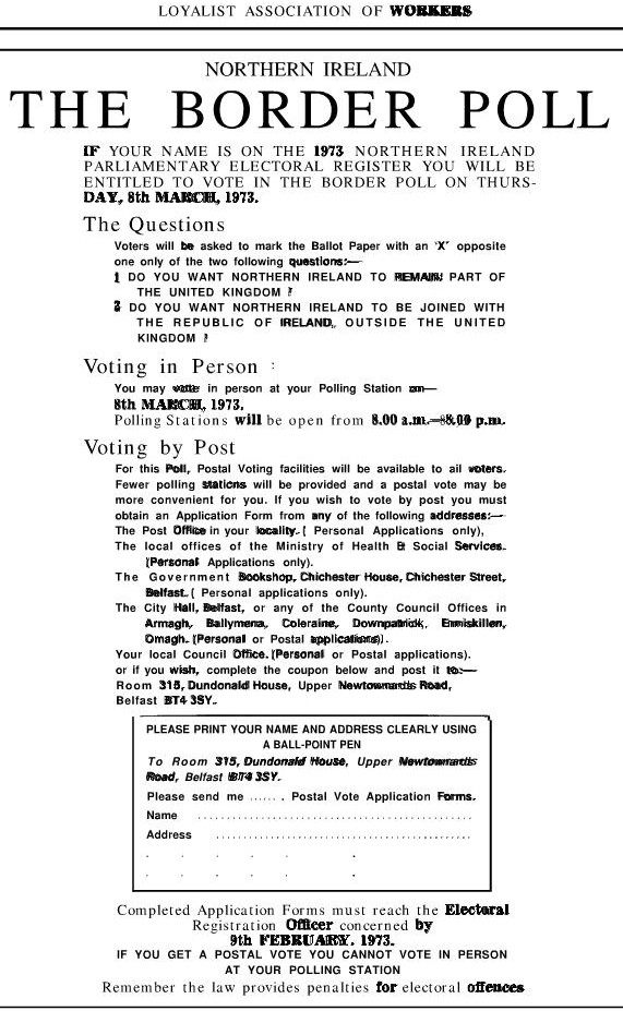 From the 1973 Northern Ireland Border Poll a leaflet from a group called the ‘Loyalist Association of Workers’ with information about the poll and details of obtaining a postal vote.