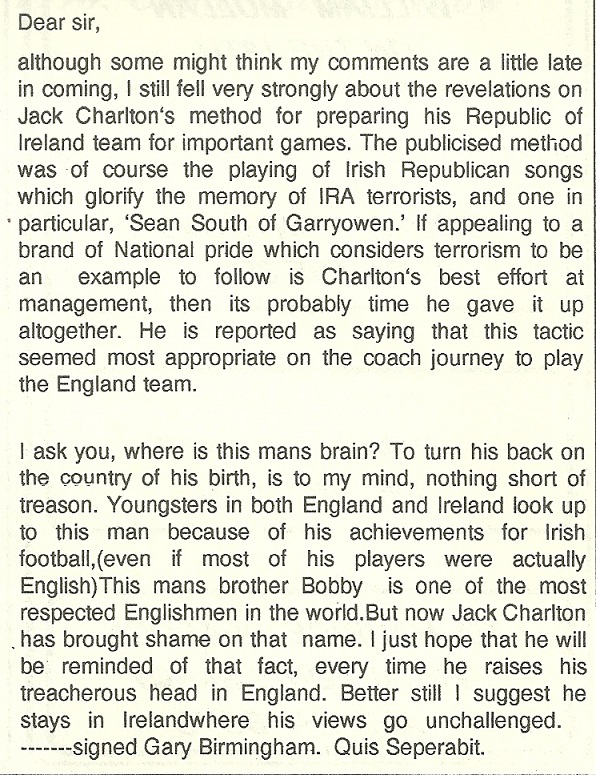 From the November 1990 edition of the UDA magazine “Ulster” , the correspondent isn’t too happy with Jack Charlton and the Irish team singing rebel songs!