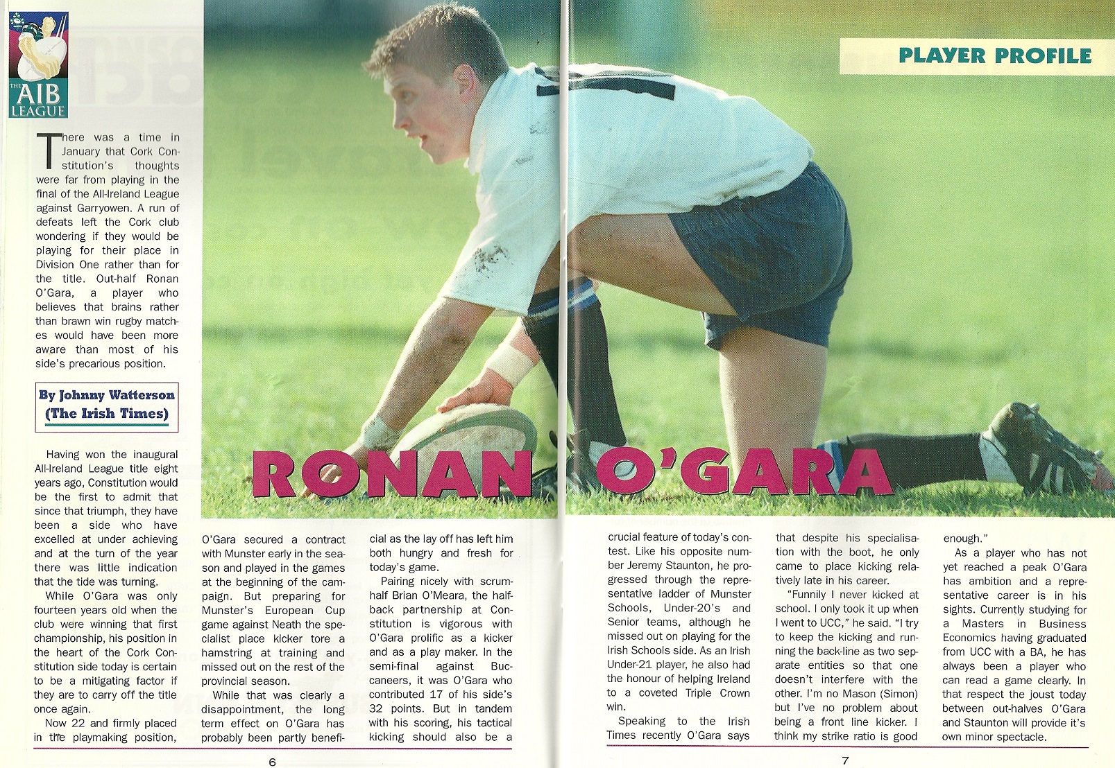 From the programme of the 1999 AIL League final at Landsdowne Road between Cork Con and Garryowen a profile of a youngish Ronan O’Gara.
