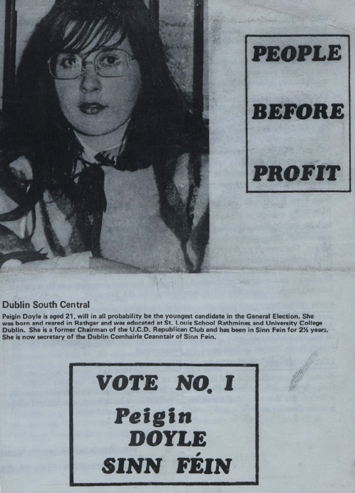 From the 1973 General Election a leaflet from Peigin Doyle who was running for Official Sinn Fein in Dublin South Central. She polled 1521 votes and missed out on a seat. She also stood in the 1974 Local Elections in Pembroke/Rathmines polling 962 votes and also missing out on a seat.