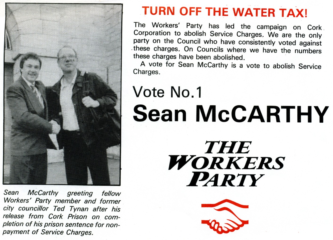 From the 1994 Cork South Central by-election a leaflet from Sean McCarthy who was running for the Workers Party. He polled 813 votes. He is pictured with Ted Tynan (a WP councillor from 1979-82 and again from 2009) who was one of 5 anti service charges protesters in Cork jailed in 1990. Sean is still an active WP member.