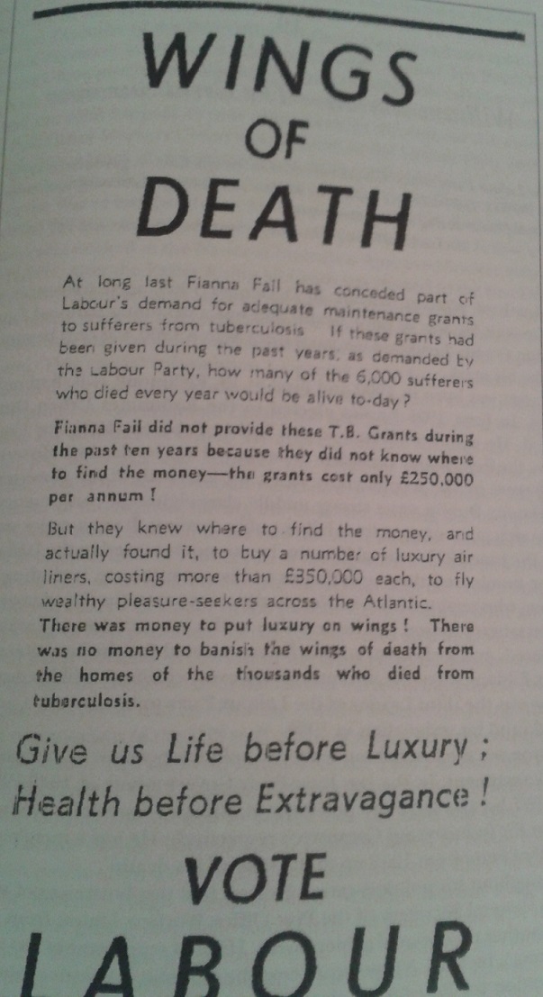 From the 1948 General Election Campaign a Labour Party leaflet “Wings of Death” attacking Fianna Fails spending on Aircraft rather than on TB sufferers.