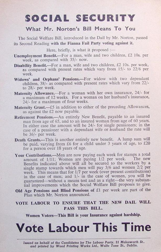 From the 1951 General Election campaign “Fianna Fail – for the Workers!” where Fianna Fail outline the benefits workers enjoyed under Fianna Fail.