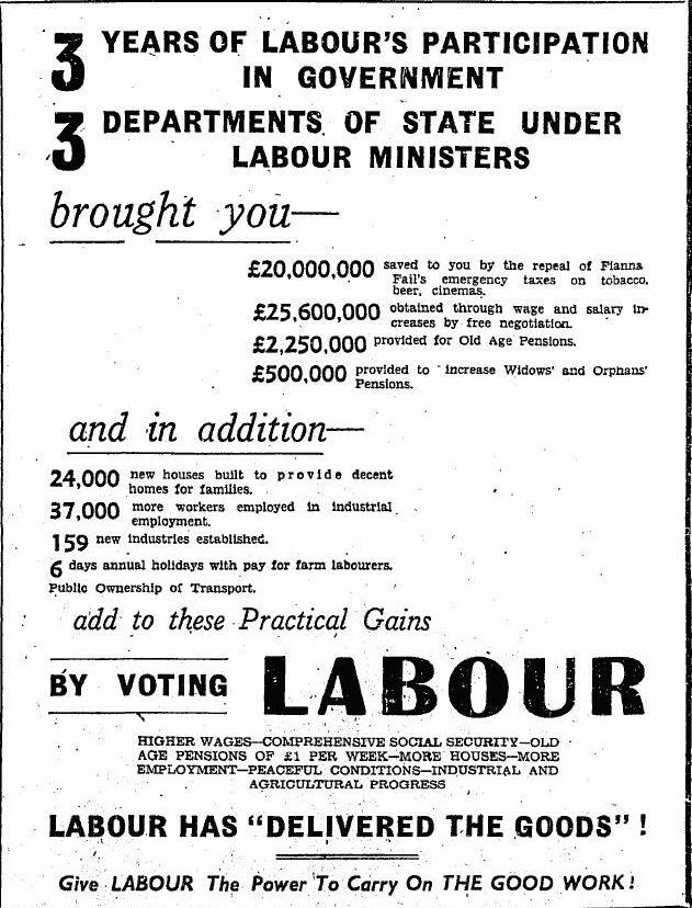 From the 1951 General Election campaign “Fianna Fail – for the Workers!” where Fianna Fail outline the benefits workers enjoyed under Fianna Fail.