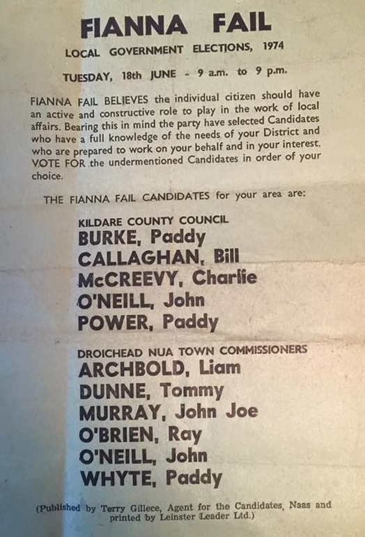 From the 1974 Local Elections a leaflet for the Fianna Fail candidates running for Kildare County Council in Naas LEA and for Newbridge Town Council.