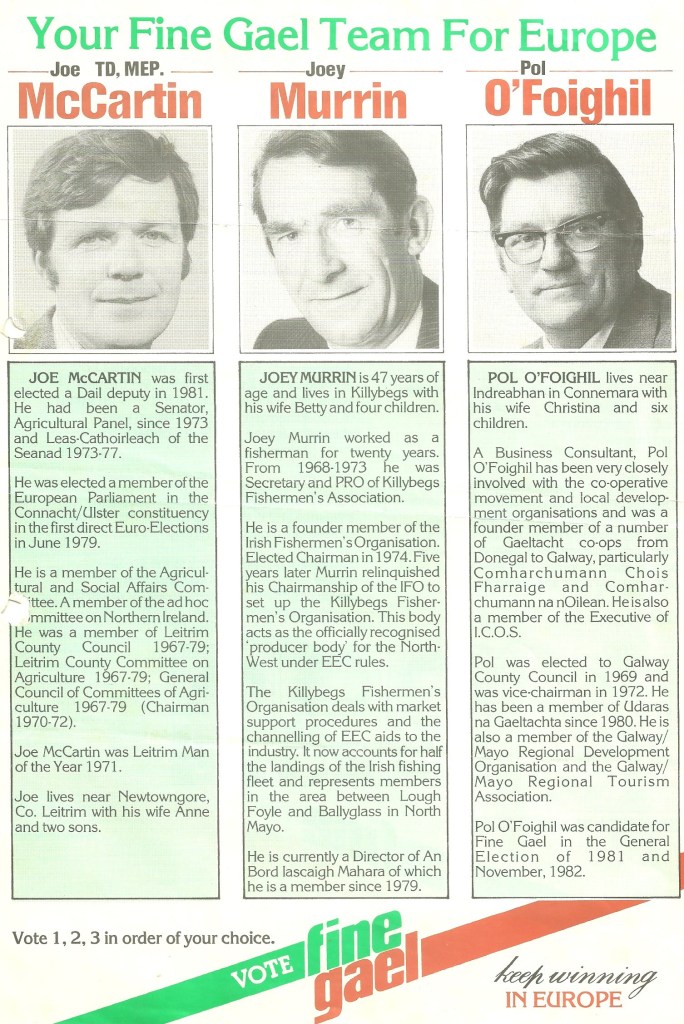 From the 1984 European Elections a leaflet for Joe McCartin, Joey Murrin and Pol O’Foighil running for Fine Gael in Connacht/Ulster. Joe McCartin was elected.
