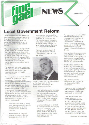 Quite a detailed newsletter issued by Fine Gael in June 1985 around the time of the Local Elections.