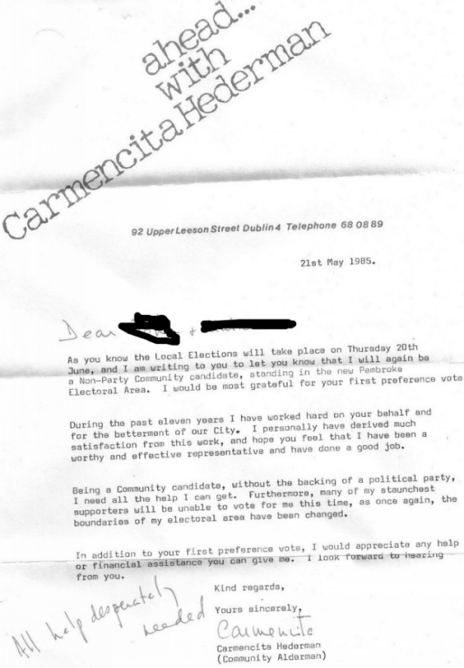 A Letter from Carmencita Hederman looking for help and funds for the 1985 Local Elections. Carmencita Hederman served from 1974 to 1999 on Dublin City Council as an Independent. She was also elected to the Senate for Trinity in 1989.