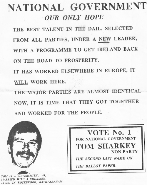 ‘National Government -Our Only Hope’ wrote Independent candidate Thomas Sharkey running in the 1987 General Election in Dublin South.