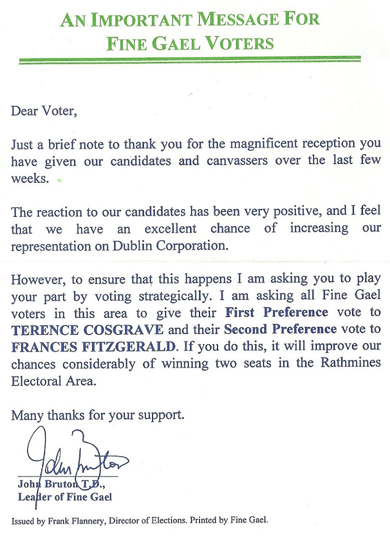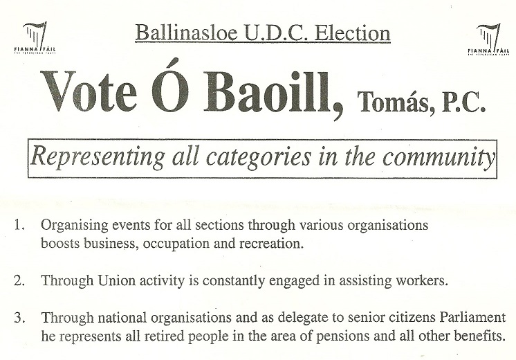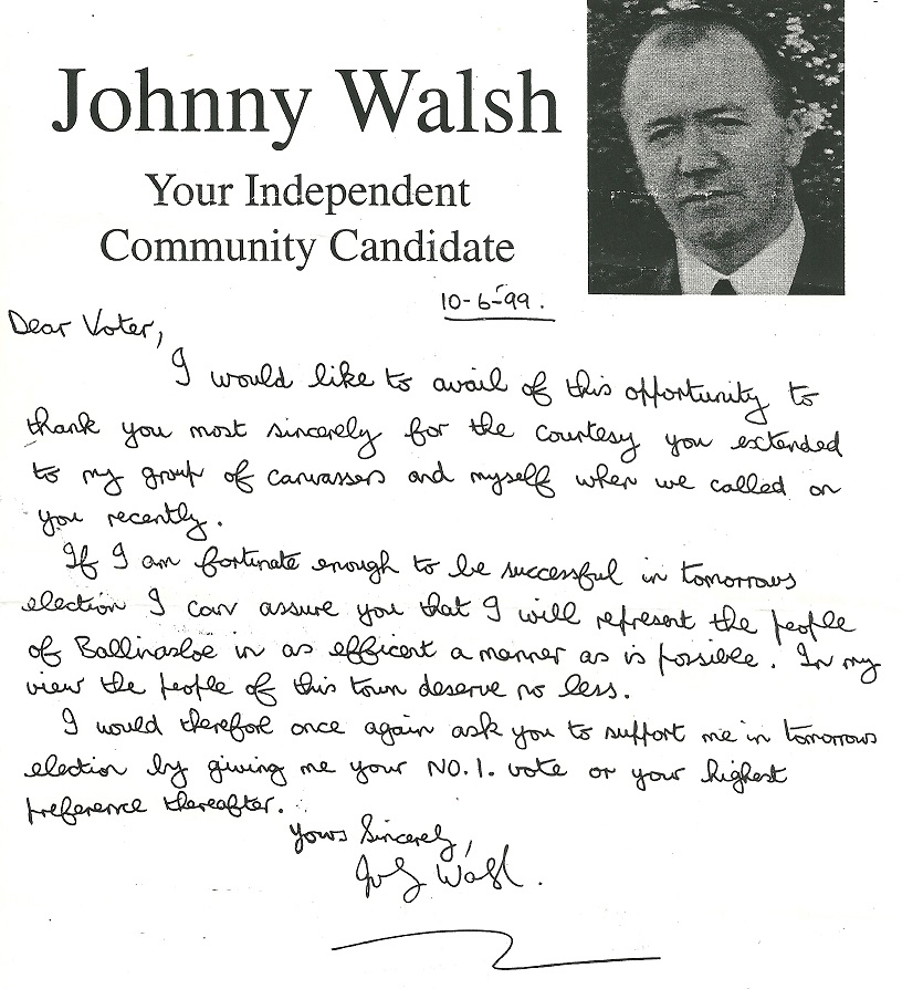 From the 1999 Local Elections a leaflet from Michael Flynn running for the Progressive Democrats in Tramore. IN the poll for the County Council he polled 387 votes and missed out on a seat, however he was elected to Tramore Town Council with 258 votes.