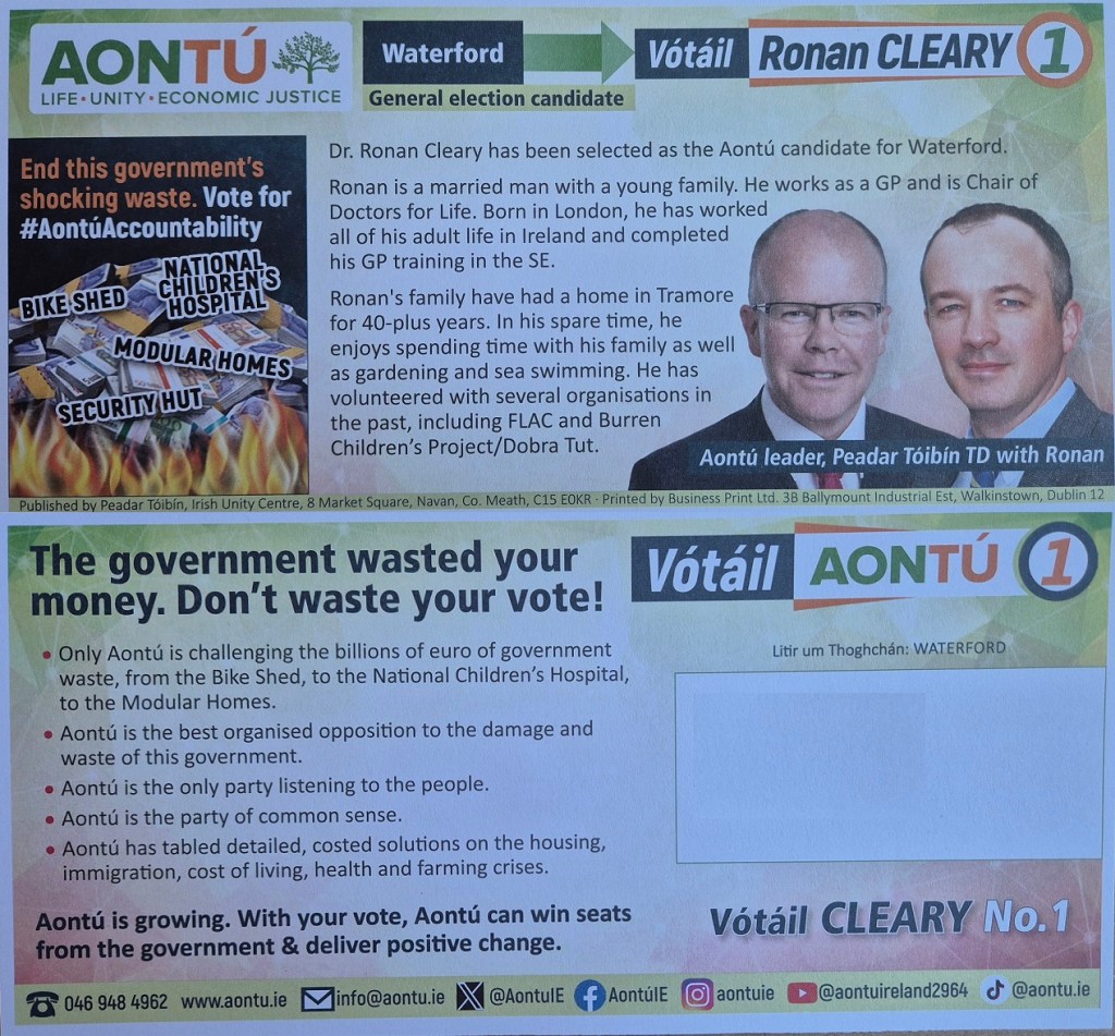 A Leaflet from Ronan Cleary who is running for Aontú in Waterford in the 2024 General Election