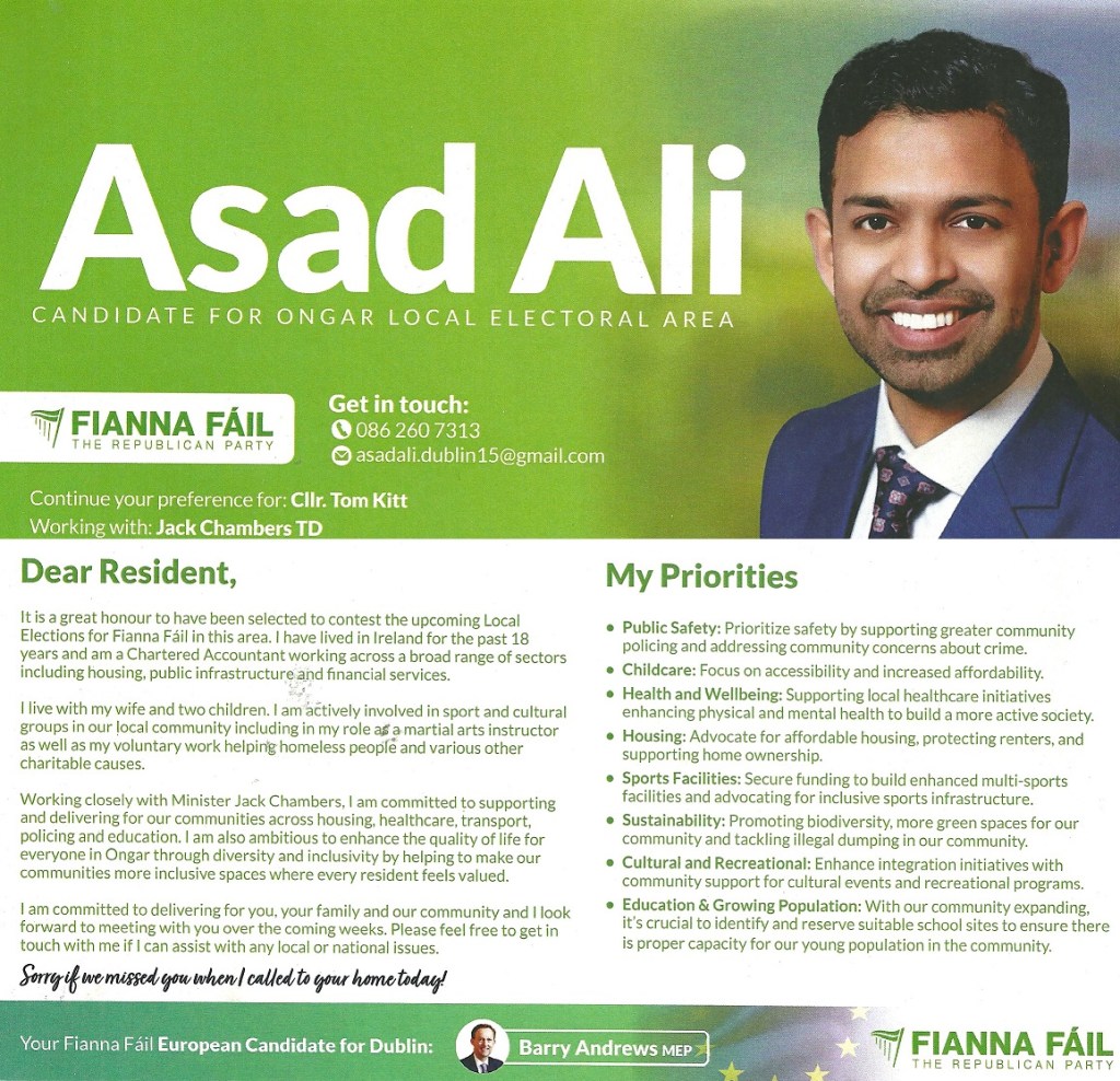 A leaflet from Asad Ali who is running for Fianna Fáil in Ongar in the 2024 Local Elections