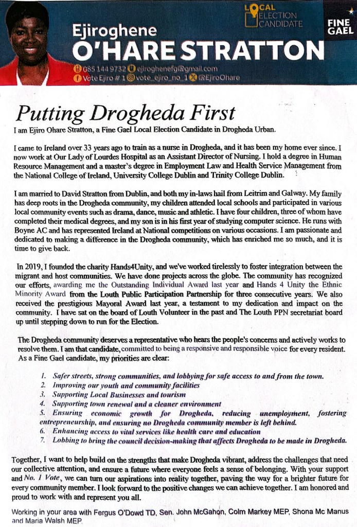 A Leaflet from Ejiroghene O’Hare Stratton who is running for Fine Gael in Drogheda Urban in the 2024 Local Elections