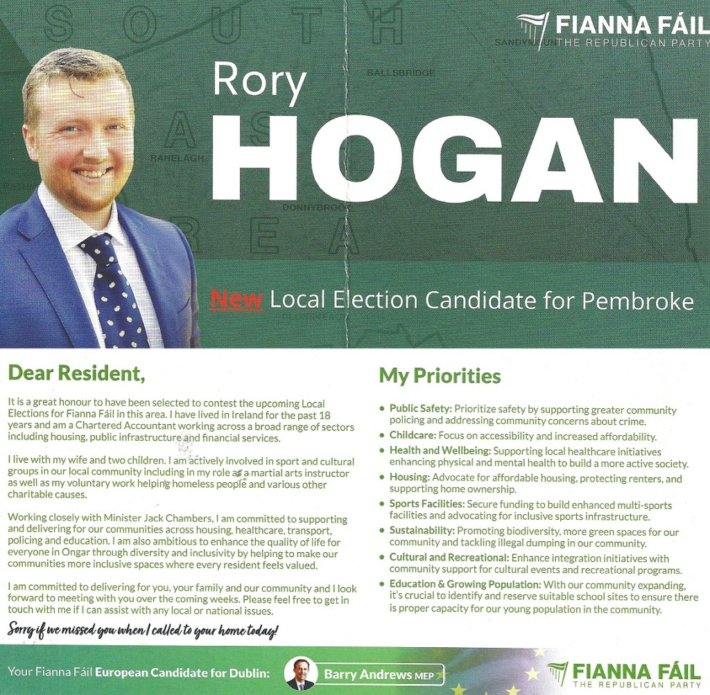 A leaflet from Rory Hogan who is running for Fianna Fáil in Pembroke in the 2024 Local Elections
