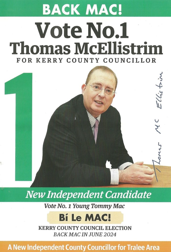 A Leaflet from former Fianna Fáil TD Thomas McEllistrim who is running as an Independent in Tralee in the 2024 Local Elections