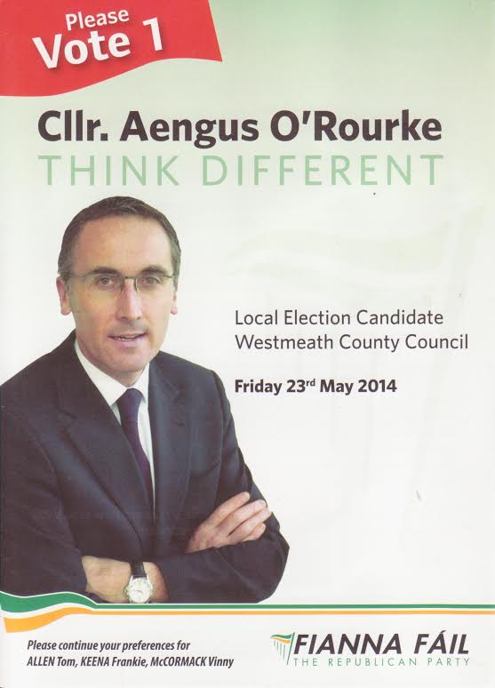 A flyer from Aengus O’Rourke who is running for Fianna Fail in Athlone, for a seat on Westmeath County Council.