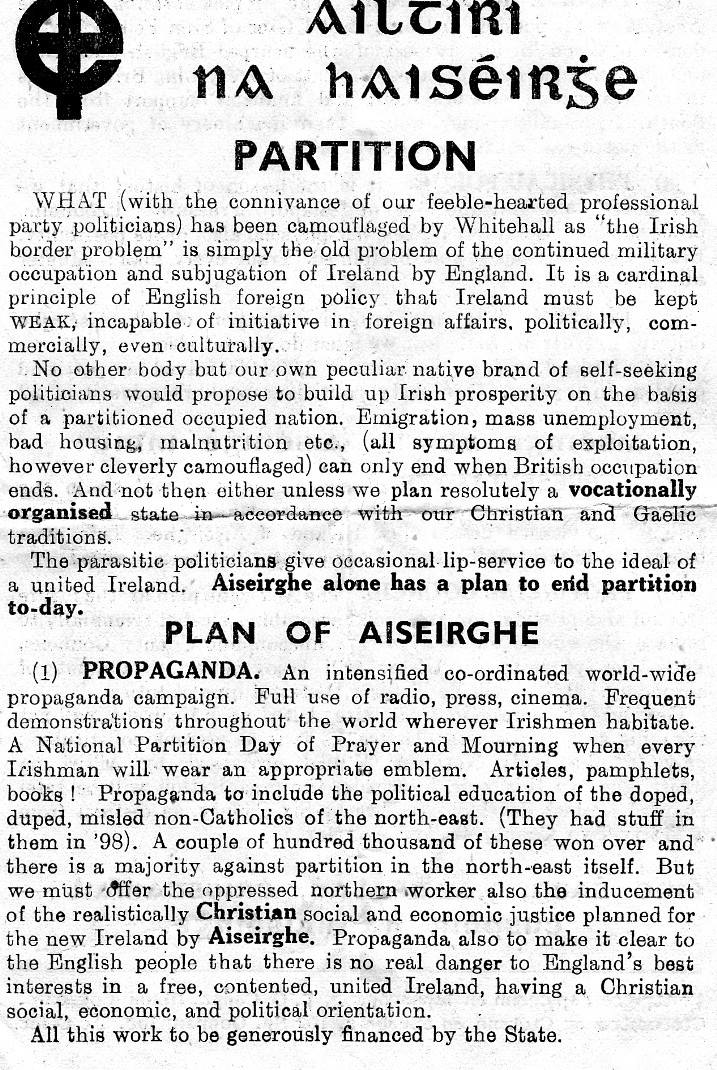 From 1946 a 36 page booklet “Partition -A Positive Policy” produced by Ailtirí na hAiséirghe outlining in deatil the party’s plan to end partition.