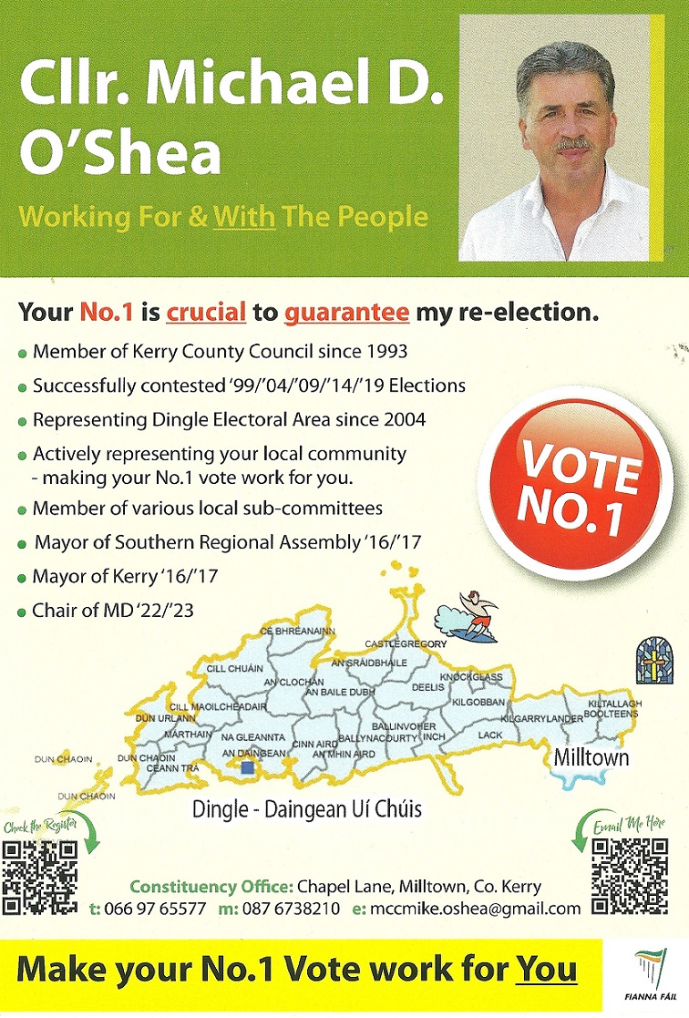 A Leaflet from Michael D O’Shea of Fianna Fáil running in An Daingean for a seat on Kerry County Council.