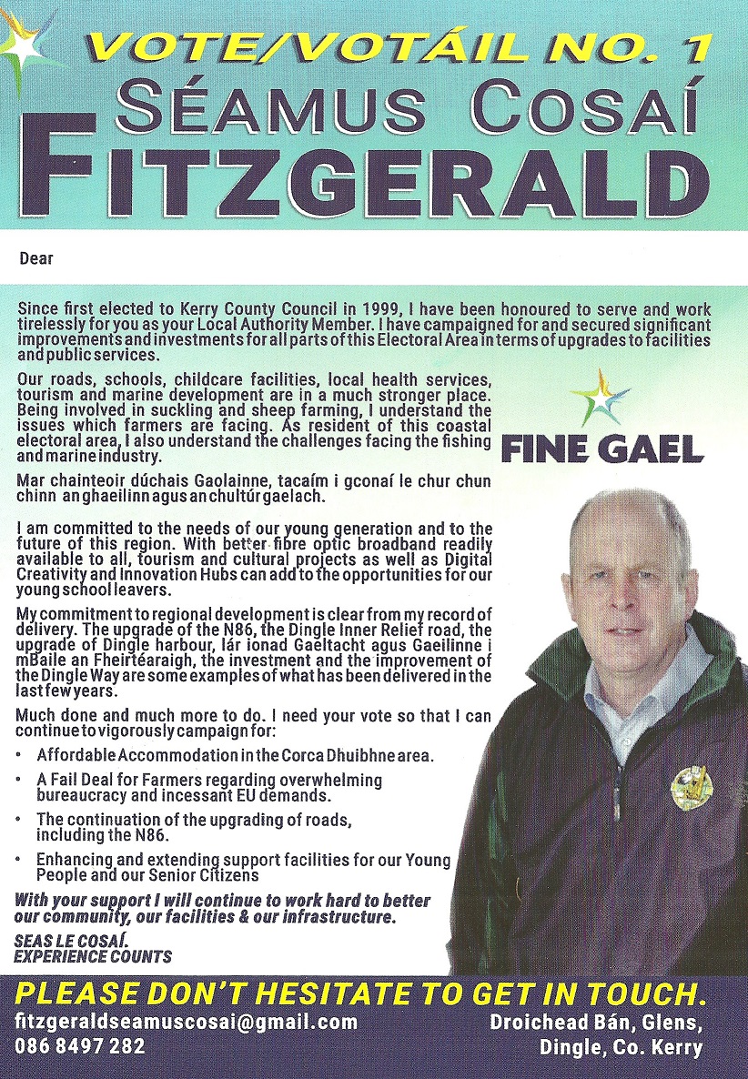 A Leaflet from Séamus Cosaí Fitzgerald running for Fine Gael in An Daingean for a seat on Kerry County Council.