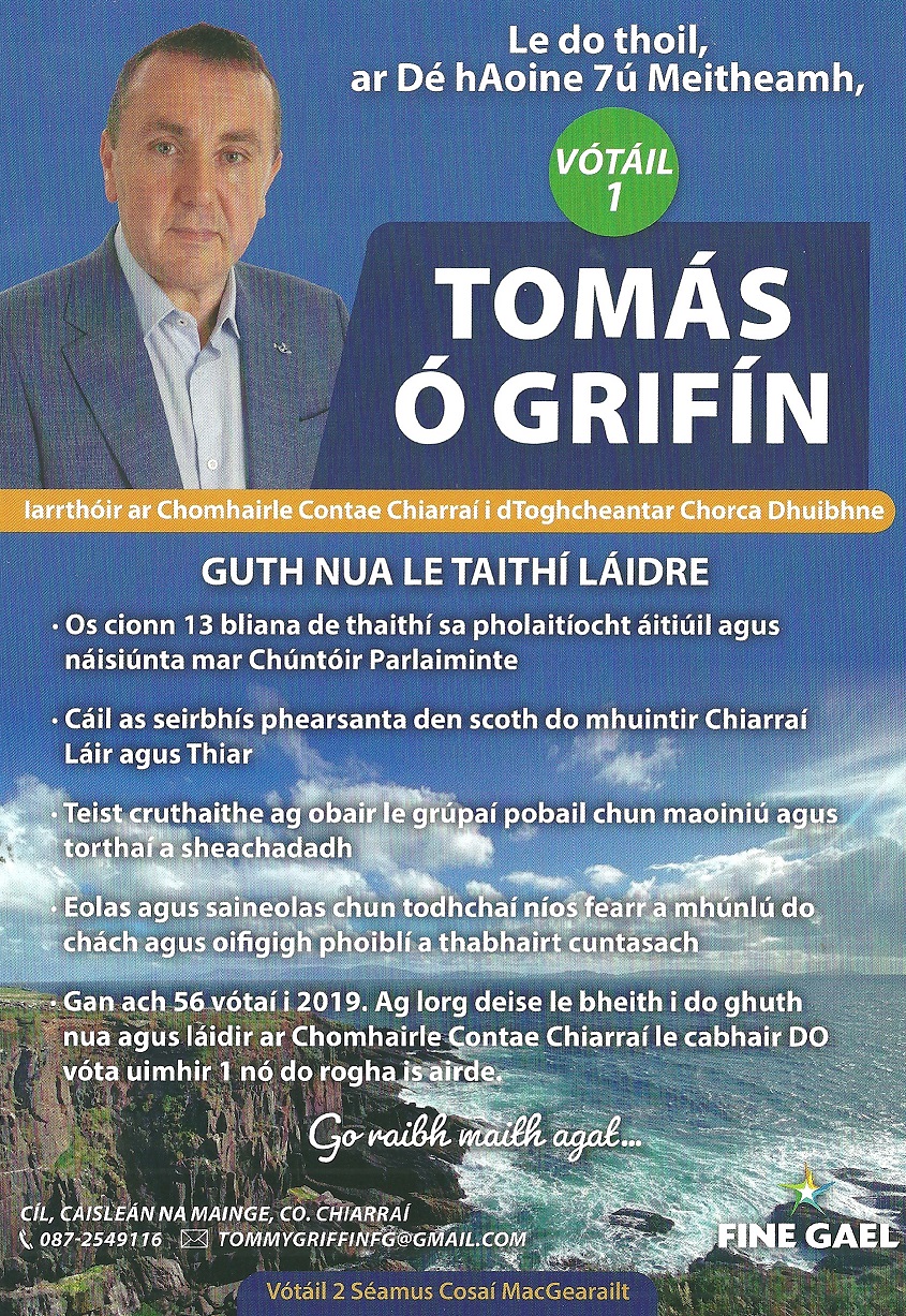 Bileog as Gaelige agus as Bearla from Tommy Griffin of Fine Gael running in An Daingean / Dingle for Kerry County Council