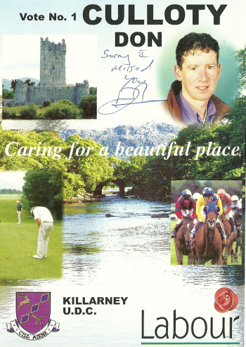 From the 1999 local elections a leaflet for Labour candidate Don Culloty running for a seat on Killarney UDC. He polled 138 votes and failed to be elected. I’m curious if he is any relation to former Jockey and now Trainer Jim Culloty.