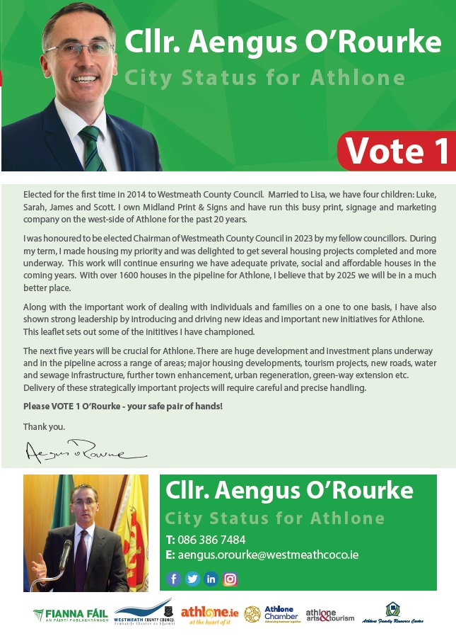 A leaflet from Aengus O’Rourke who is running for Fianna Fáil in Athlone (Westmeath) in the 2024 Local Elections.