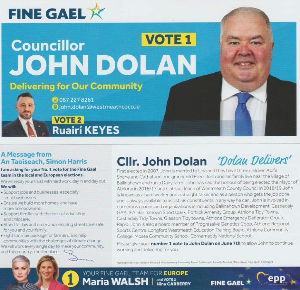 A Leaflet from John Dolan of Fine Gael who is running in Athlone for a seat on Westmeath County Council.