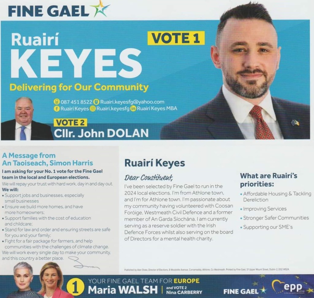A leaflet form Ruairí Keyes who is running for Fine Gael in Athlone (Westmeath) in the 2024 Local Elections