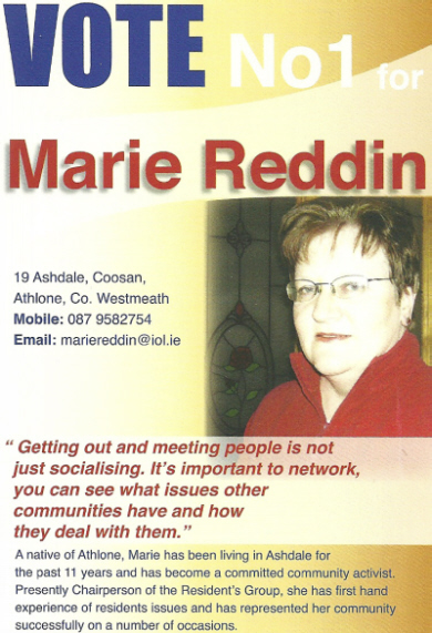 From the 2009 Local Elections. Independent candidate Marie Reddin who was unsuccessful in her attempt at winning a seat on Athone Town Council.
