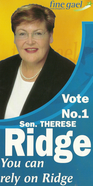From the 2002 General Election a leaflet for unsuccessful Fine Gael candidate Therese Ridge running in Dublin Mid West . She had previously stood in 1987 and 1992. She failed to win a seat both times.