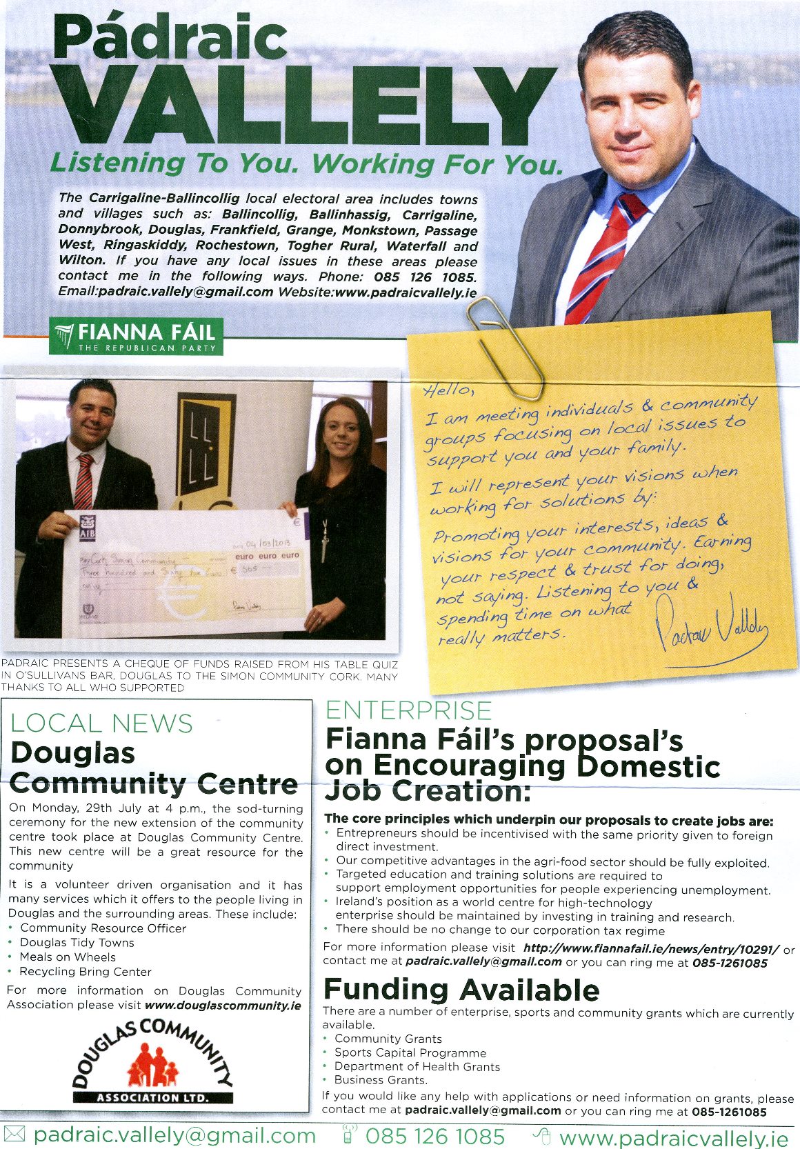 Leaflet from Padraic Vallely- Fianna Fail -Carrigaline -Cork March 4, 2013