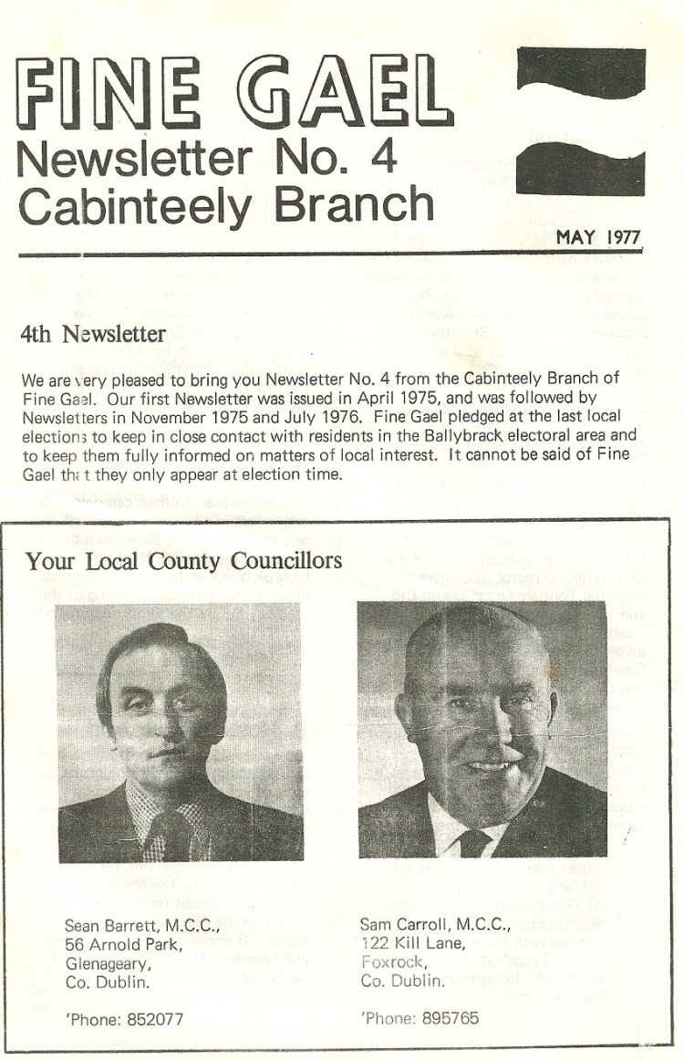 The Fine Gael Cabinteely Branch Newsletter no.4 from May 1977. There’s a focus on Sam Carroll and Sean Barrett as well as issues such as phones in Ballybrack, Cabinteely Community School and other issues.